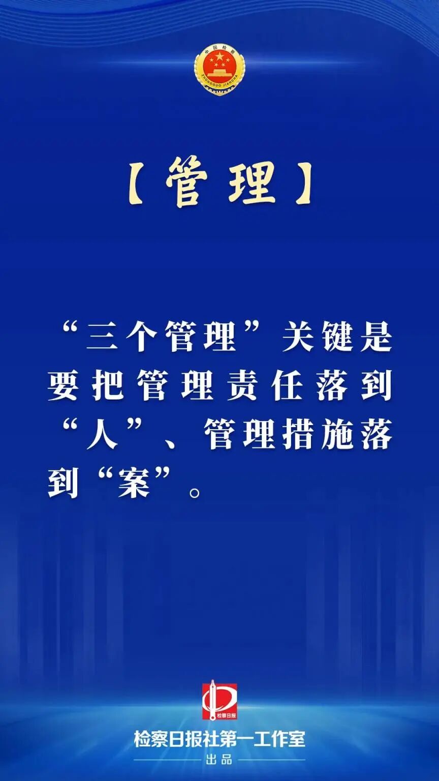 高质效办案必须加强高水平管理。调研中,应勇检察长对进一步细化抓实“三个管理”提出要求:“三个管理”关键是要把管理责任落到“人”、管理措施落到“案”。要因地制宜细化完善“三个管理”的具体举措,聚焦岗位职责、案件类型、流程环节,构建源头责任落实、案件过程管控、质量检查评查、质效分析研判的全流程管理机制。抓实案件质量检查评查,逐步做到“每案必检”,基础是检察官的“每案自检”。要坚持实事求是,既要防止蜻蜓点水、流于形式,也要防止层层加码、叠床架屋,给基层和办案检察官增加负担。
