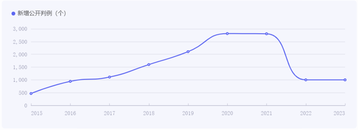 统计数据显示,从2014年到2019年,每年新增公开的裁判文书数呈现出快速增长的趋势。特别是从2016年开始,每年新增公开的份数超过了900万份。在2020年,新增公开的份数达到了峰值,为2813万份。然而,从2021年开始,每年新增公开的裁判文书数出现了下降的趋势,特别是从2021年到2023年,每年新增公开已降至1000万份左右。
